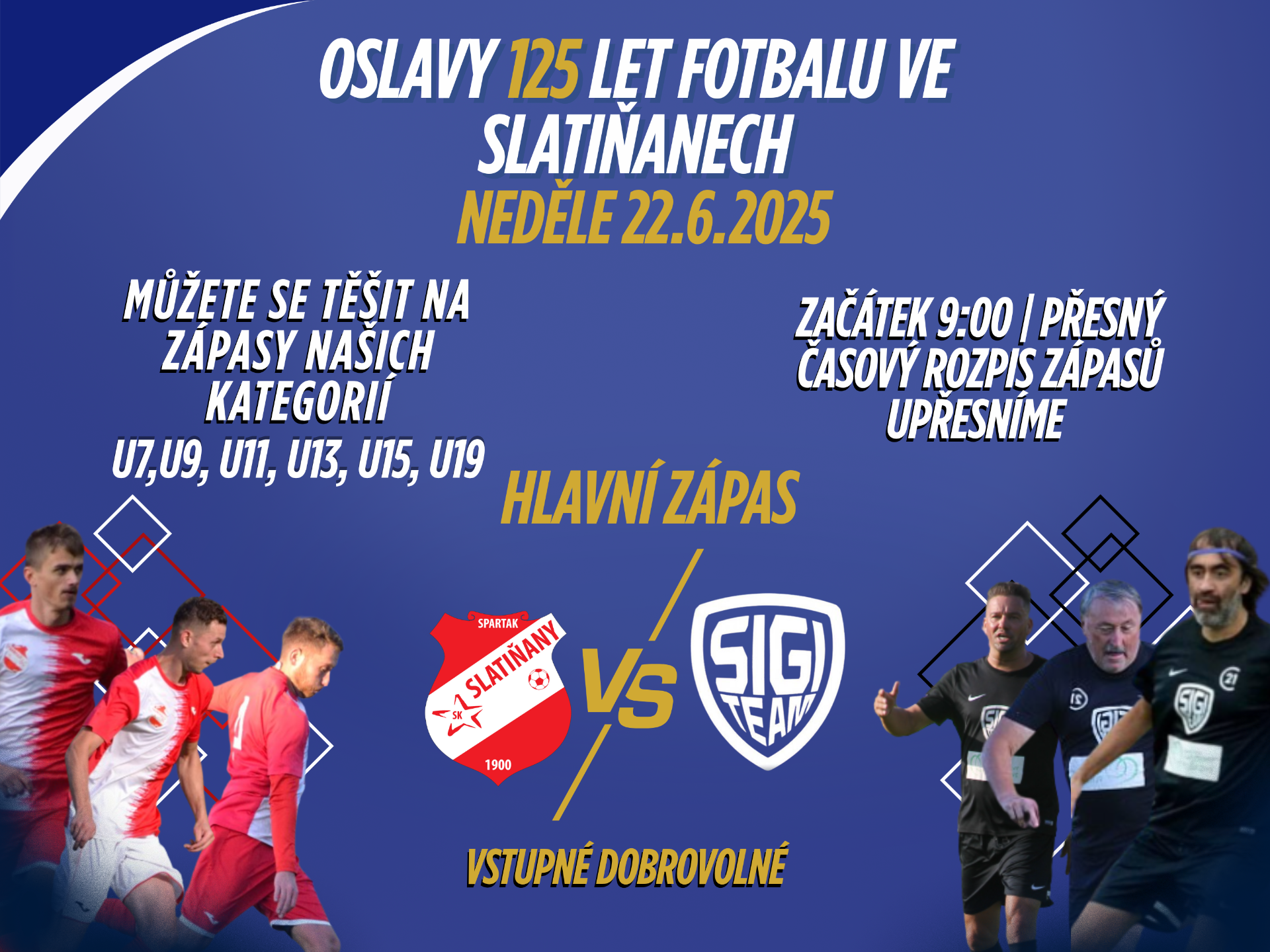 Tak termín oslav 125 let od založení klubu je venku ! Celodenní nálož slatiňanského fotbalu. Po celý den od rána přátelské zápasy od nejmenších kategorií až po dospělý tým, složený z neregistrovaných bývalých hráčů s mixem A+B, který se utká proti již našemu starému známému, SIGI TEAMu. Přesný časový harmonogram sdělíme s předstihem, stejně jako jména potvrzených hráčů ze SIGI TEAMu. Vstupné dobrovolné. Těšíme se na Vaši návštěvu a také na Vaši podporu fotbalu v našem městě.