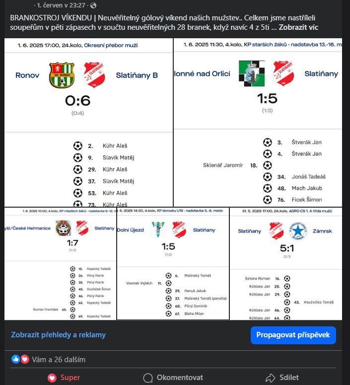Psal se víkend 31.5-1.6.2025, když naše týmy zatížily konta soupeřů neskutečnými 28 góly, když navíc 4 z 5ti zápasů hráli na venkovních hřištích.