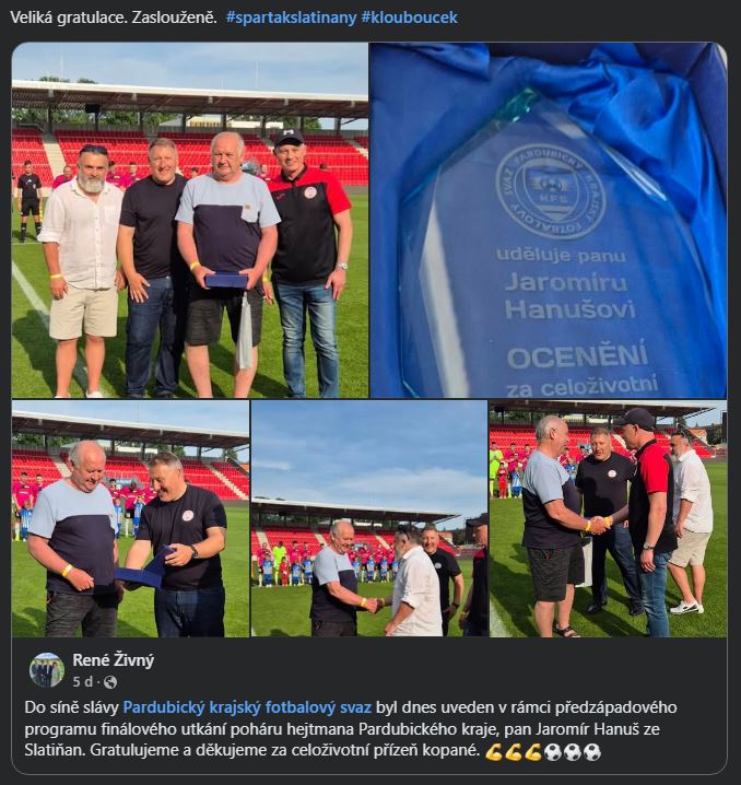 Ocenění našeho dlouholetého hráče, trenéra a nyní funkcionáře Slatiňan, Jaromíra Hanuše, cenou FAČR - Dr. Václava Jíry za celoživotní zásluhy a rozvoj fotbalu. Obrovská a zasloužená gratulace ! Přejme si, aby ještě po dlouhá léta měl stále chuť vykonávat funkci sekretáře ve fotbalovém oddíle SK SPARTAK SLATIŇANY, ve které je aktuálně nenahraditelný.